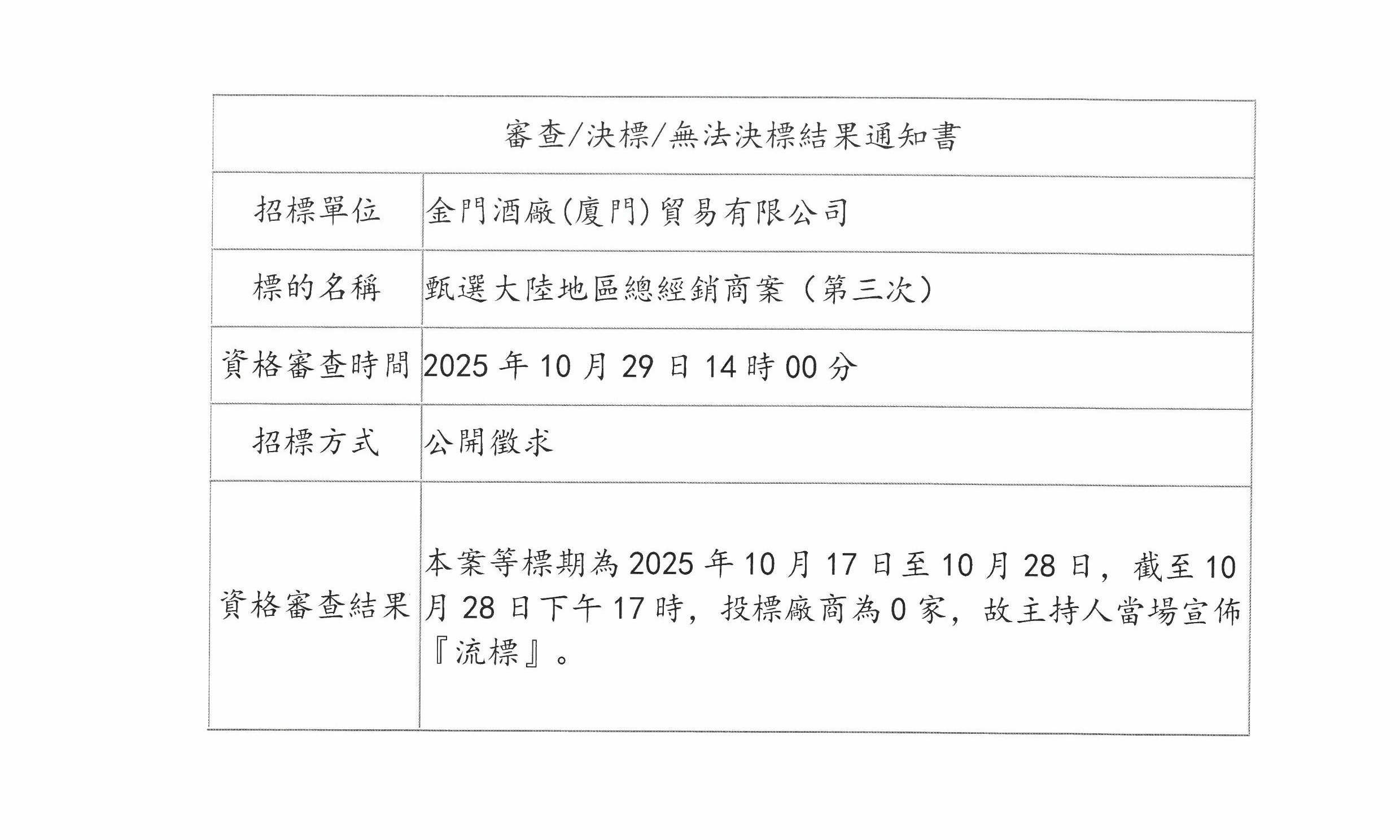 招标单位:金门酒厂(厦门)贸易有限公司标的名称:甄选大陆地区总经销商案(第三次)资格审查时间:2025年10月29日14时00分招标方式:公开徵求资格审查结果:本案等标期为2025年10月17日至10月28日,截至10月28日下午17时,投标厂商为0家,故主持人当场宣布『流标』。