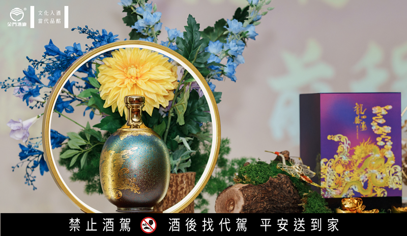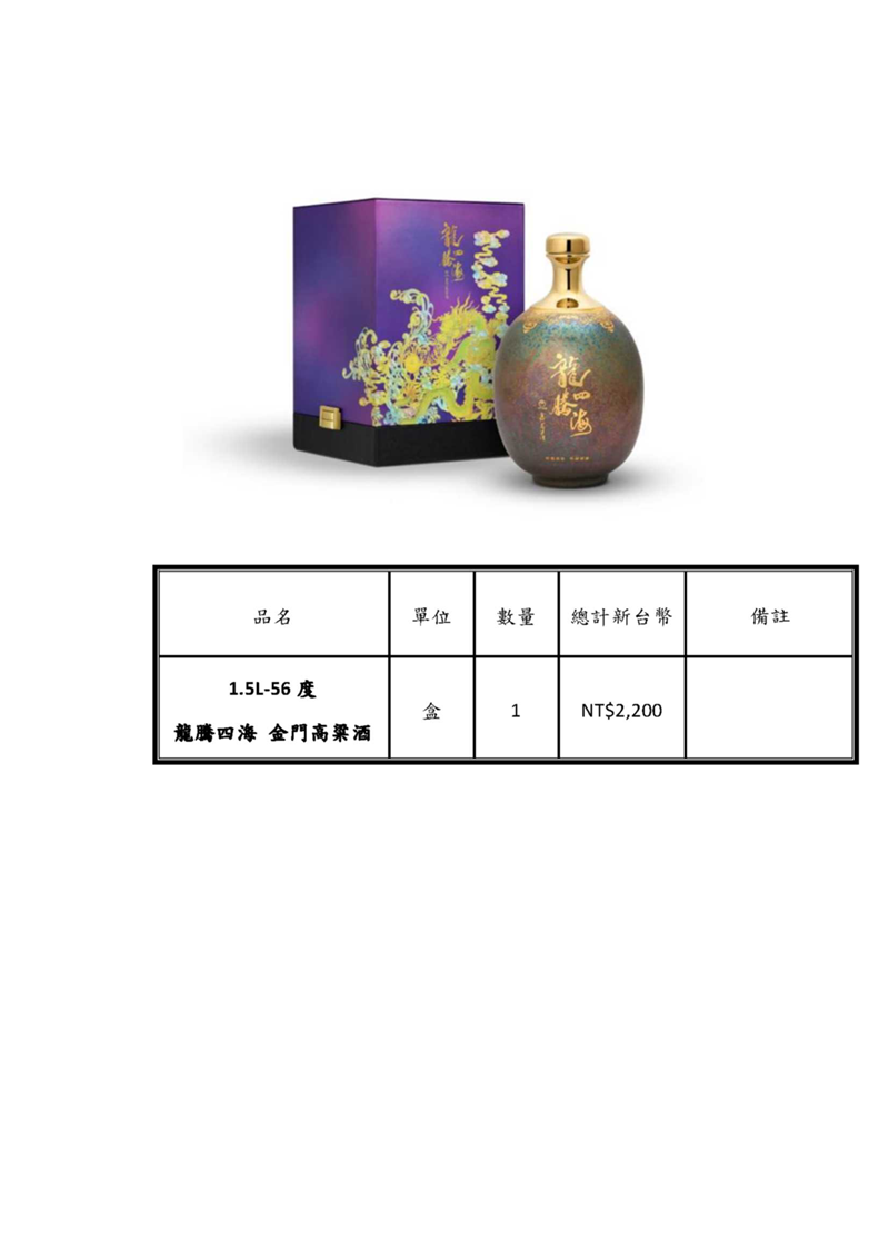 《1.5L-56度 龙腾四海 金门高粱酒》,特别以精致陶瓷为器,多彩结晶釉药烧制後,瓶身肩部至瓶口处再加以镀钛鎏金亮金,绽放绮幻迷离之炫彩,一如龙麟闪灼,流光熠熠,绝美金彩。瓶身上的翔龙图腾及苍劲潇洒书法字「龙腾四海」则以金致烧花工艺,展现华美尊荣感,象徵气势如龙,锦绣向荣!外盒以优雅坚毅的绦紫色,意味紫气东来,金龙遨游,锦云氤氲,前景灿烂。并由金门酒厂首席品酒师组织勾调团队,严选窖藏各式优质陈年酒基,以酒勾酒的独特勾调技艺,窖藏三年淬炼而成,孕化出极品佳酿,口感细致温醇、陈香优雅柔和,尾韵陈香与熟果香风味缭绕,是值得细细品嚐陈年酒款。高超酒艺,卓绝瓷器,交相辉映,饶富收藏价值,独具增值空间。