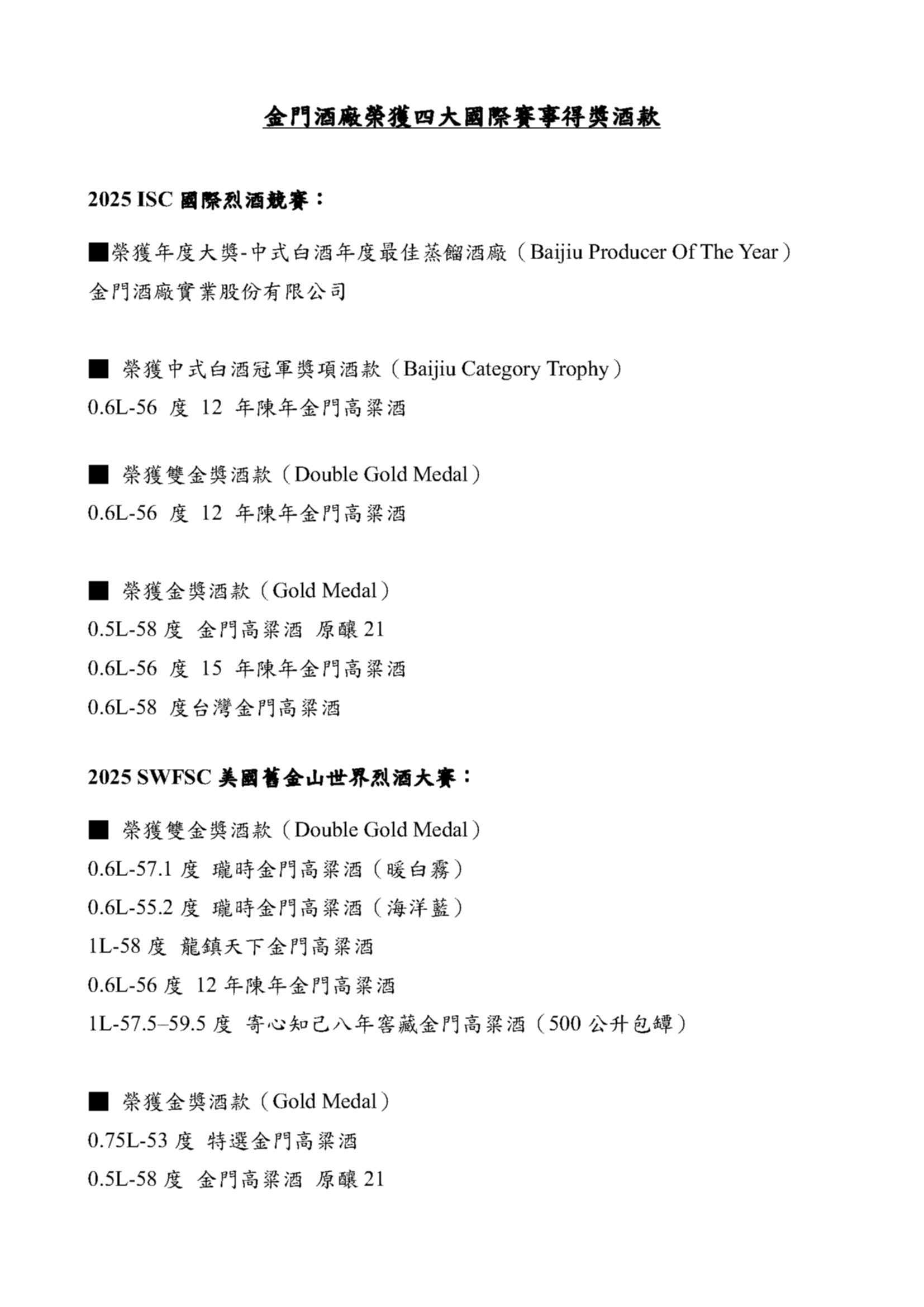 金门酒厂於ISC国际烈酒竞赛再创辉煌荣耀,9月25日在英国伦敦举办的2025国际烈酒竞赛暨30周年庆颁奖典礼(International Spirits Challenge, ISC)中,《0.6L-56度12年陈年金门高粱酒》荣获中式白酒类别最高荣誉奖项—冠军奖盃(Trophy in the Baijiu Category);金门酒厂则获选年度大奖—中式白酒年度最佳蒸馏酒厂殊荣 (Baijiu Producer Of The Year),同时在该赛事横扫21面奖牌,是台湾区唯一荣获1面双金奖与3面金奖的代表,也是中式白酒类别获奖最多的品牌。今年盛典适逢ISC国际烈酒竞赛 30周年庆典,吸引全球酒界权威专家与业界领袖齐聚,为金门酒厂的国际地位再添光采,成为在全球中式白酒领域上最大赢家。