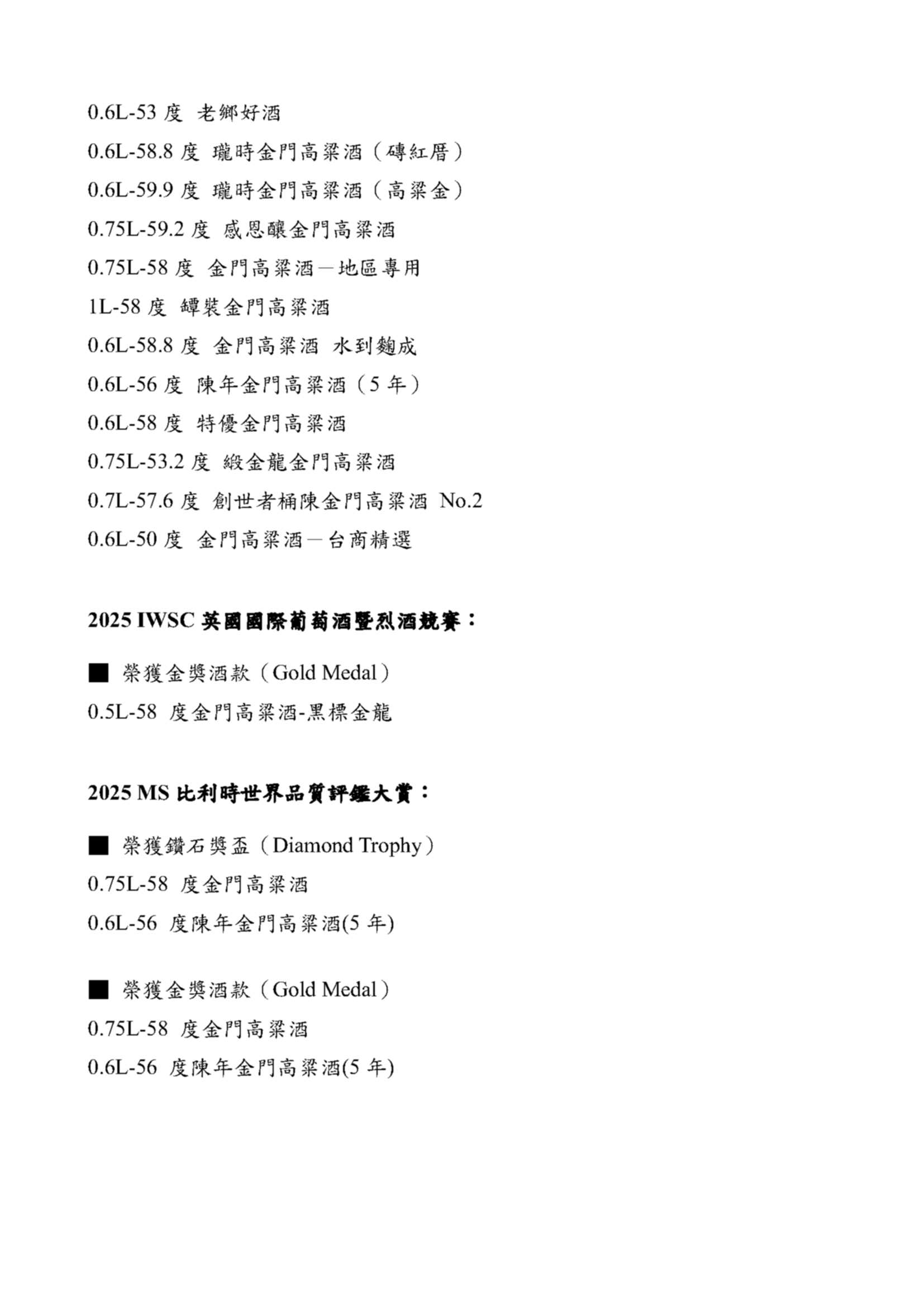 金门酒厂以卓越制酒技艺在国际竞赛不断突破自我,在比利时世界品质评监大赏(Monde Selection, MS),金门酒厂出品的两款家喻户晓经典酒品《0.75L-58度金门高粱酒》与《0.6L-56度陈年金门高粱酒(5年)》分别荣获金奖,两款佳酿连续三年荣获金奖以上肯定,表现卓越与稳定的品质,双双获颁该赛事特别荣誉钻石奖盃,为金门高粱酒打下坚实口碑。上半年则在美国旧金山世界烈酒大赛(San Francisco World Spirits Competition, SFWSC)表现惊艳,不仅荣获5面双金奖,更凭藉14面金奖成为该赛事金奖数量最多的中式白酒品牌。而在英国国际葡萄酒暨烈酒竞赛(The International Wine and Spirit Competition)金门高粱酒是台湾唯一夺下金奖的品牌,也是横跨台湾与中国地区所有参赛酒款评分最高的酒款,更进一步展现金门酒厂世界级的制酒实力。