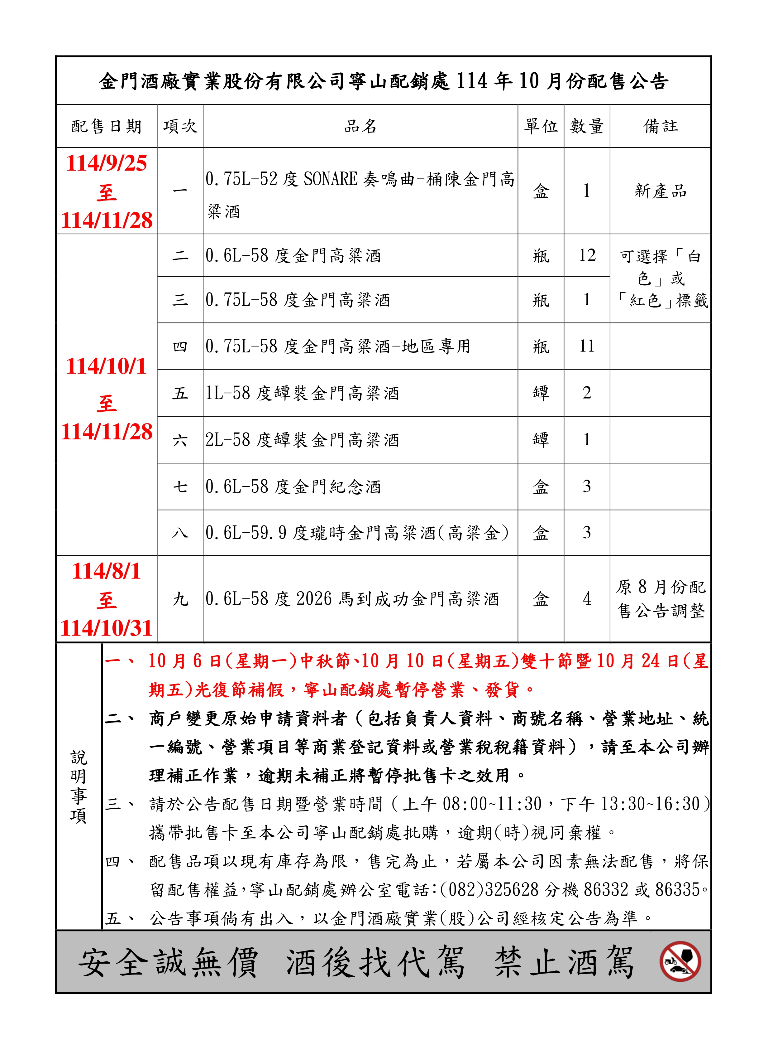 本公司寧山配銷處114年10月份配售公告
